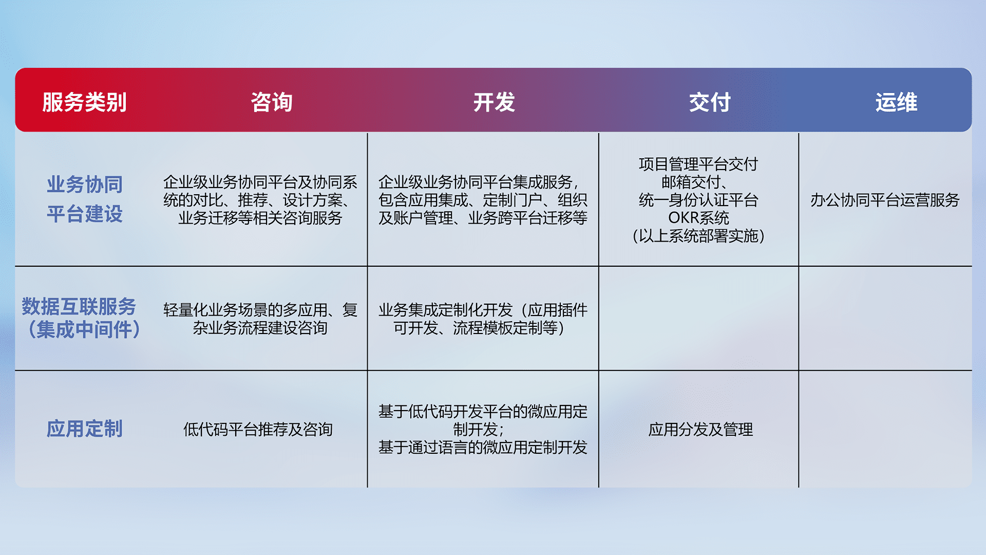 针对钉钉、、、、企微、、IDaas等平台级产品提供产品的规划、、方案、、交付、、、、定制化开发等服务,,实现如统一协同办公、、、智能客户服务、、混合会议管理、、、智能数据查询、、、等业务场景,,实现数字化转型。。。。