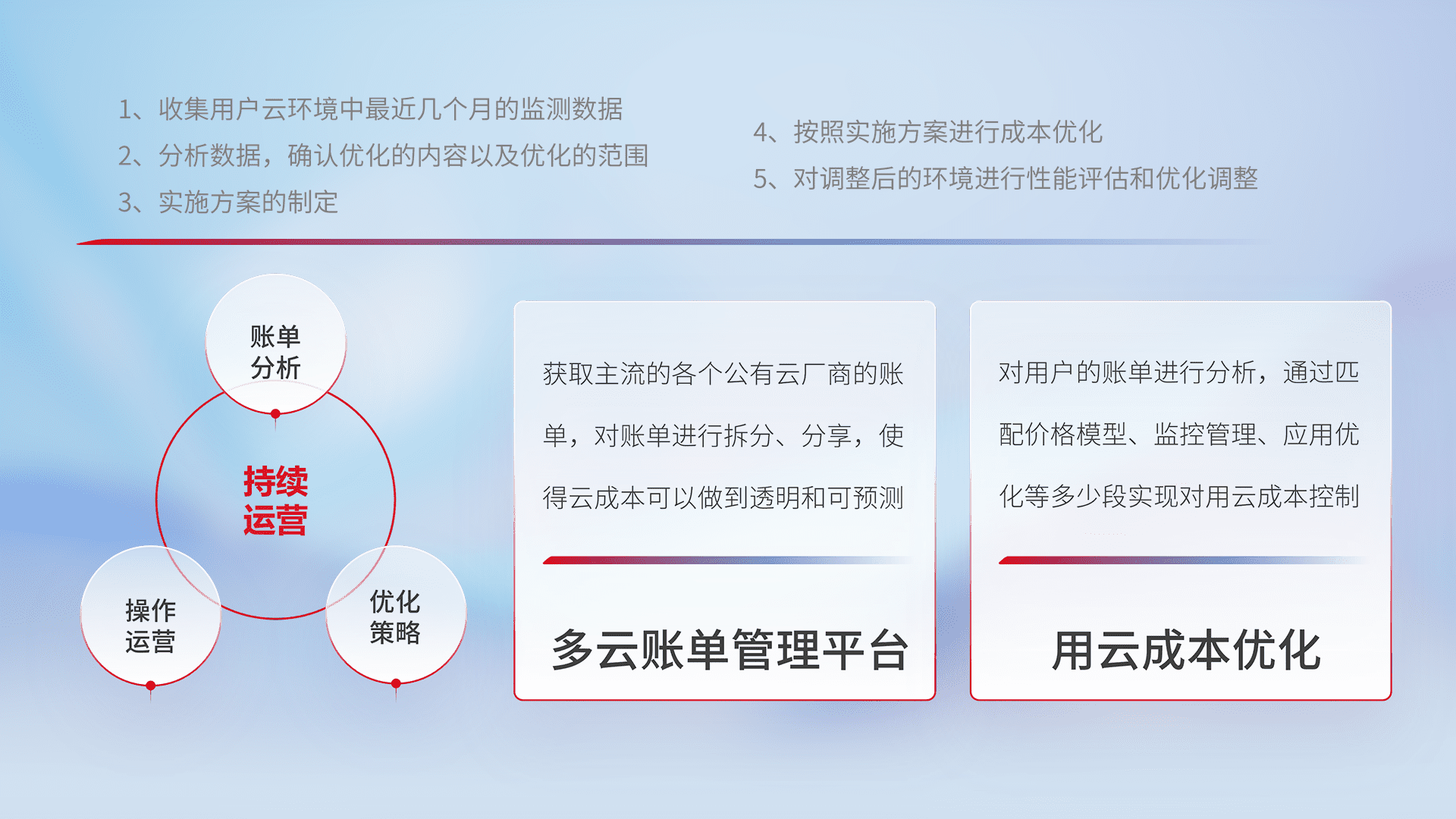 通过多云纳管,,,,以统一的资源数据模型把客户的云资源进行抽象和封装,,,进而实现对多云资源的统一操作,,,保障云资源管理的可靠性、、、、稳定性与可用性。。。。量身定制化运维内容,,,,配置、、开发运维、、补丁管理、、、备份、、、、监控、、、、认证和访问管理、、、、审计和日常巡检等,,,保障在用云过程中的可靠度,,,,稳定度以及高可用率。。。。